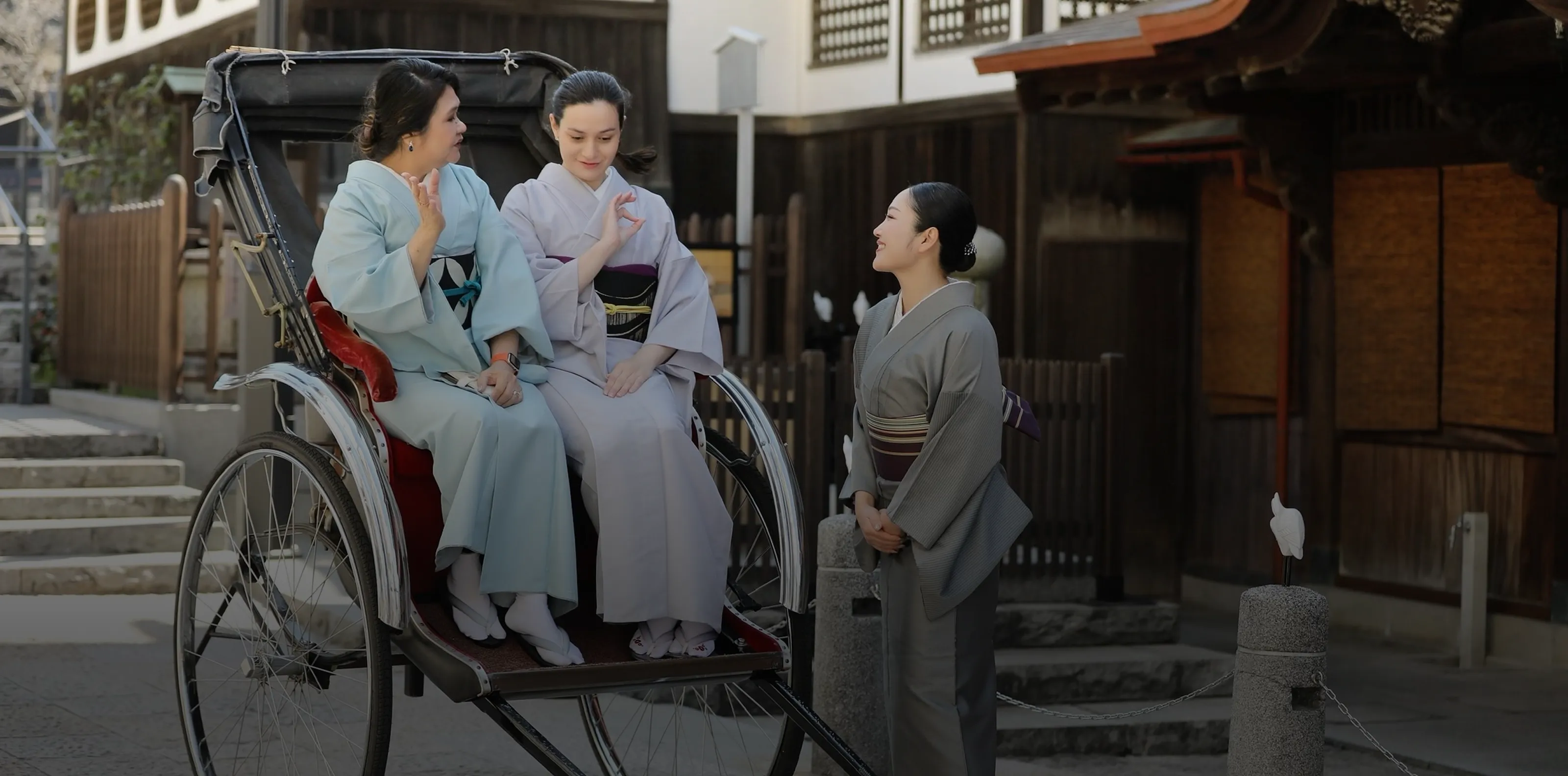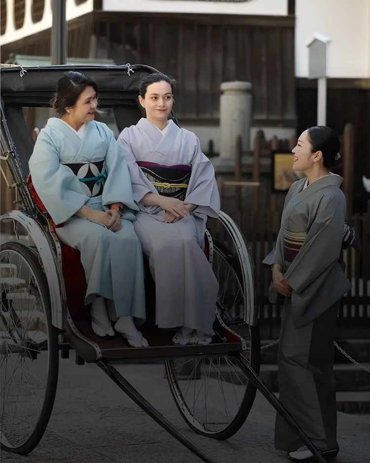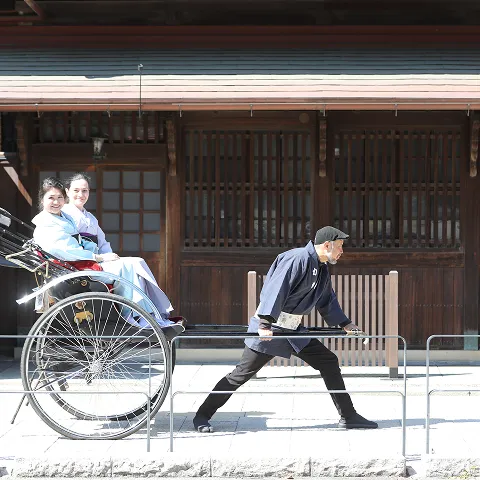 人力車と記念撮影の特別体験着物をまとい、道後の町をゆっくり歩く特別なひととき。歴史ある温泉街の風景の中で、人力車に乗りながら道後の魅力を巡ります。